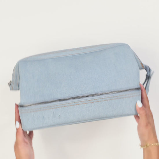 Your daily routine just got a denim moment. This limited edition dopp kit features two spacious compartments, clear interior pockets, and a clever snap loop so you can hang it up and keep your products off the sink. Finished with co-branded debossing, tonal metal details, and easy-to-clean lining. Perfect for packing all your potions, sprays, and just-in-case extras.